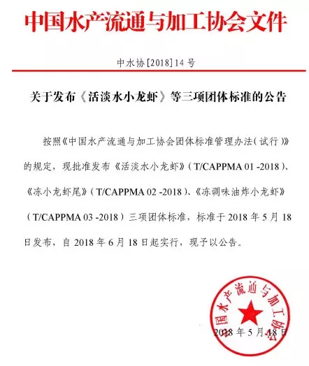 5月18日,經中國水產流通與加工協(xié)會批準,由中國小龍蝦協(xié)會及協(xié)會成員單位共同起草、編制的《活淡水小龍蝦》(T/CAPPMA 01 -2018)、《凍小龍蝦尾》(T/CAPPMA 02 -2018)、《凍調味油炸小龍蝦》(T/CAPPMA 03 -2018)三項團體標準正式發(fā)布。
