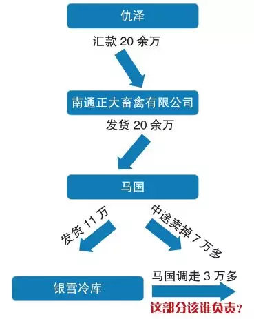 馬國出逃后,仇澤找正大食品(南通)有限公司商量解決方案,最后不得不先接受該公司的提議:正大食品(南通)有限公司以每噸貨少收2000元的方式,先將馬國私挪的貨款7萬多元補(bǔ)齊。但馬國私自將仇澤代儲在銀雪冷庫價值1萬多元的貨調(diào)出賣掉一事,公司不予承認(rèn);對于馬國在分銷過程中將1萬多元的貨款私吞一事,也不予賠償。在正大食品(南通)有限公司看來,這都是馬國的個人行為,與公司無關(guān),同時希望和仇澤通過法律途徑解決。