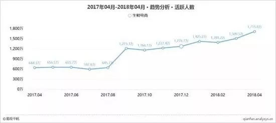 易觀數(shù)據(jù)顯示,進(jìn)入四月,天氣回升,各類鮮果開始上市。生鮮電商瞄準(zhǔn)時(shí)機(jī),紛紛加強(qiáng)營(yíng)銷活動(dòng)的推廣,其移動(dòng)端應(yīng)用活躍人數(shù)也呈現(xiàn)發(fā)展態(tài)勢(shì)。2018年4月,生鮮電商應(yīng)用活躍人數(shù)達(dá)到1715.8萬(wàn),活躍用戶環(huán)比增長(zhǎng)13.7%。