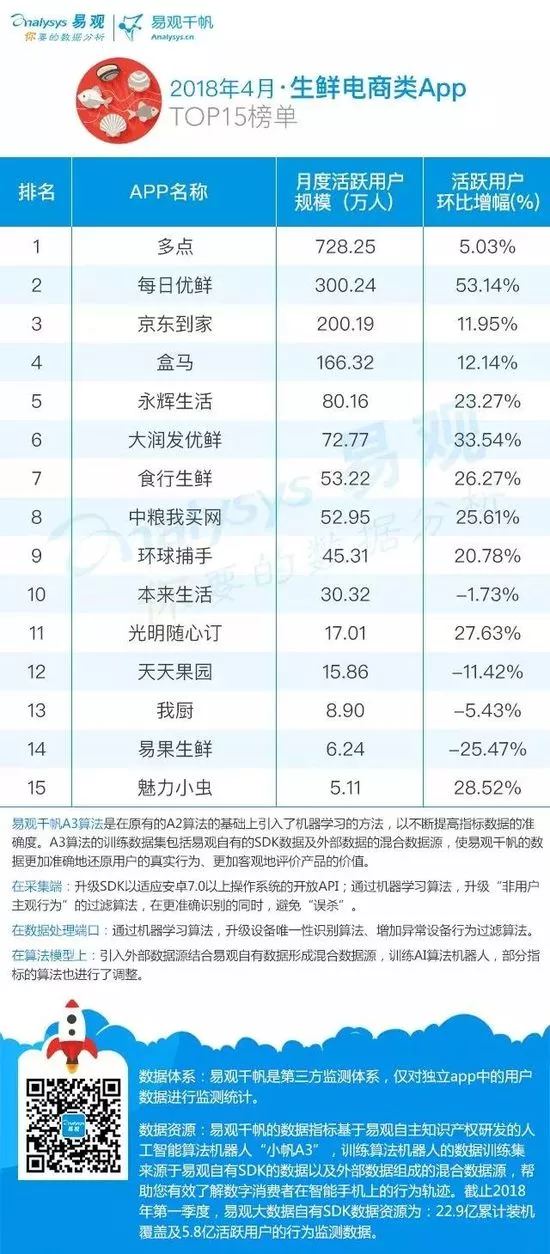 來(lái)源: 冷凍食品網(wǎng) 發(fā)布者:編輯近日,易觀發(fā)布的2018年最新生鮮電商APP TOP15榜單顯示,多點(diǎn)以728.25萬(wàn)活躍用戶規(guī)模依舊占據(jù)榜首,每日優(yōu)鮮以300.24萬(wàn)活躍用戶規(guī)模位居第二,京東到家以200.19萬(wàn)活躍用戶位居第三。