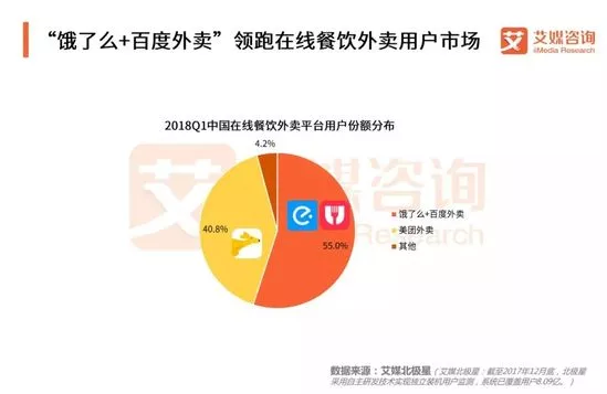iiMedia Research(艾媒咨詢)數(shù)據(jù)顯示,在2018年第一季度,餓了么與百度外賣仍占優(yōu)勢,市場用戶份額占比達(dá)55.0%,美團(tuán)外賣占比40.8%緊隨其后,市場格局兩家獨(dú)大。
