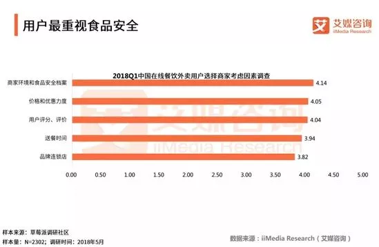 iiMedia Research(艾媒咨詢)數(shù)據(jù)顯示,在眾多因素的評分中(以5分為滿分),受訪在線外賣用戶最看重商家環(huán)境及食品安全檔案。其次,其他用戶的評分、評價(jià),以及商家的價(jià)格與優(yōu)惠力度也較為重要。