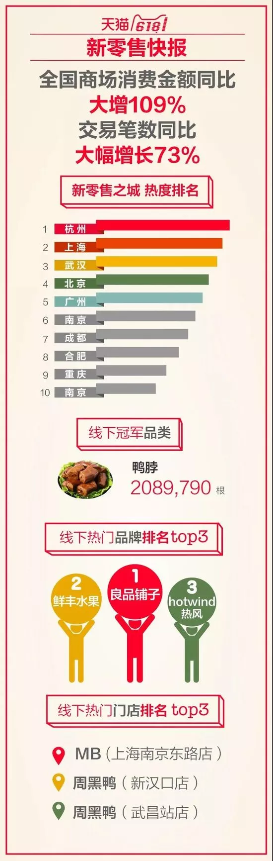 天貓新零售數(shù)據(jù)顯示,在全國10萬家天貓智慧門店中,線下交易熱度城市排名分別為杭州、上海、武漢、北京、廣州、南京、成都、合肥、重慶、南京。