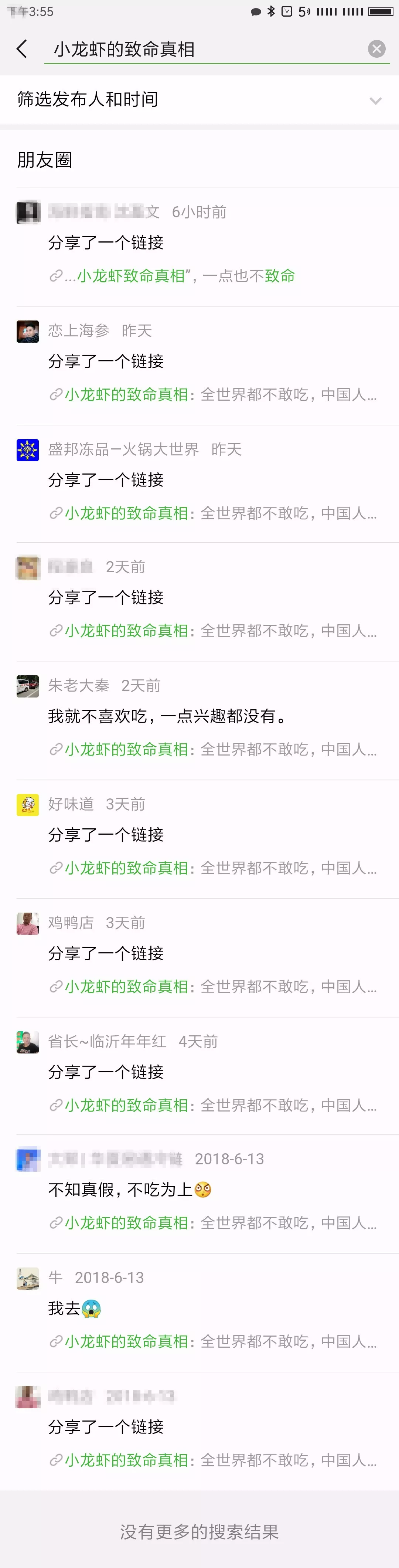 最近在朋友圈有一篇很熱的網(wǎng)文在到處流傳,題目叫做《小龍蝦的致命真相:你可能永遠(yuǎn)不知道》,這篇文章被眾多的公號來回轉(zhuǎn)載,已經(jīng)很難找到原出處在哪里,但傳播確實(shí)很廣,隨便在朋友圈里搜一下,就是這個(gè)結(jié)果。