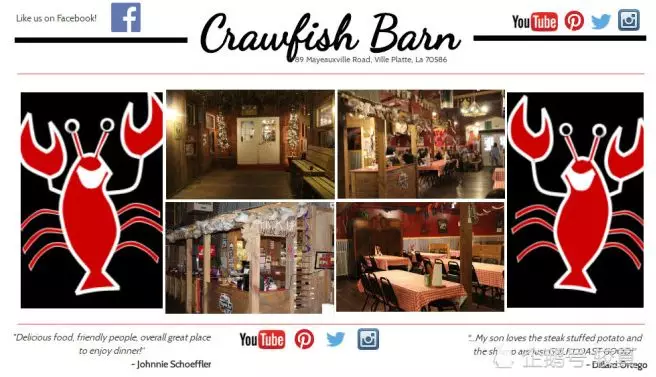 美國南方的路易斯安娜州人民也是小龍蝦愛好者,而且絕對不是網(wǎng)文中說的“小龍蝦已經(jīng)從他們的餐桌上逐漸消失”,路易斯安娜不少以小龍蝦作為招牌菜的餐館現(xiàn)在生意都紅火著呢, 像“小龍蝦大倉”(Crawfish Barn)這樣的店甚至還有自己的專屬網(wǎng)站,誰說不吃小龍蝦,餐館老板第一個(gè)拎起炒勺跟他急信不信?