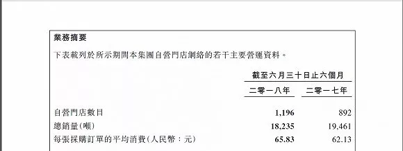 截止2018年6月30日止6個(gè)月,周黑鴨自營門店數(shù)目1196家,去年同期則為892家,增長304家,覆蓋中國16個(gè)省份及直轄市內(nèi)78個(gè)城市,但是,總銷量卻從去年同期1.9461萬噸降至如今的1.8235萬噸。不過,每張采購訂單的平均消費(fèi)則從去年同期62.13元,增至如今的65.83元。