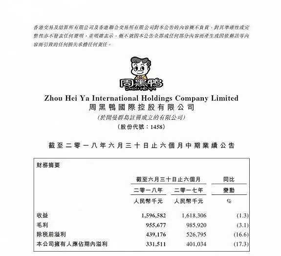來源: 冷凍食品網(wǎng) 發(fā)布者:編輯日前,周黑鴨(01458.HK)在港發(fā)布了截止2018年6月30日止6個(gè)月中期業(yè)績(jī)公告,實(shí)現(xiàn)收益約為15.97億元,和去年同期約為16.18億元相比,下降1.3%;本公司擁有人應(yīng)占期內(nèi)溢利接近3.32億元,相較于2017年上半年4.01億元,降幅在17%以上。