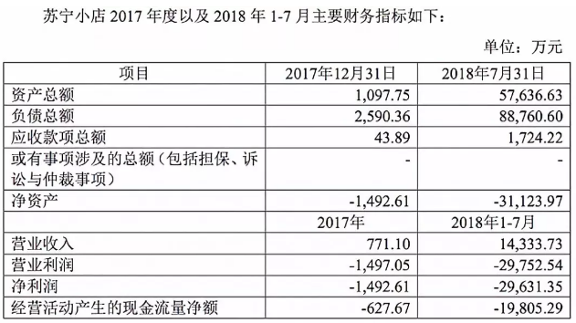 從其公告中披露出的最新業(yè)績來看,該筆增資對(duì)蘇寧小店十分重要。數(shù)據(jù)顯示,蘇寧小店2018年1至7月營收1.43億元,虧損2.96億元,債務(wù)高達(dá)6.53億元。股權(quán)轉(zhuǎn)讓的前提,即蘇寧易購清理掉此債務(wù)。此次將蘇寧小店業(yè)務(wù)剝離出上市公司,也是防止未來蘇寧小店擴(kuò)張?jiān)斐傻奶潛p影響到上市公司的業(yè)績。