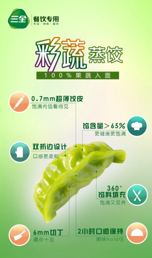 問(wèn)題的另一面,就是機(jī)會(huì)。這一次,向來(lái)以創(chuàng)新為驅(qū)動(dòng)力的三全餐飲,決定邁出開(kāi)拓性的一步:重磅推出彩蔬素餡蒸餃,并全面進(jìn)軍連鎖餐飲渠道。