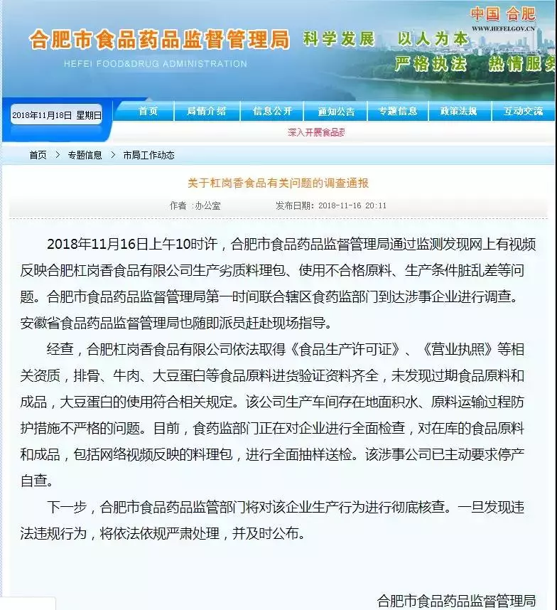 經(jīng)查,安徽合肥杠崗香食品有限公司依法取得相關(guān)資質(zhì),食品原料進貨驗證資料齊全,未發(fā)現(xiàn)過期食品原料和成品,大豆蛋白的使用符合相關(guān)規(guī)定。