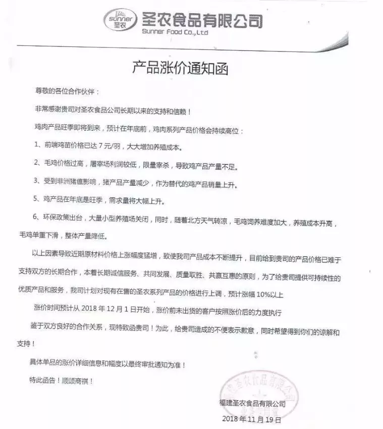 白羽雞上市公司圣農(nóng)食品發(fā)布了漲價(jià)通知,稱因受到非洲豬瘟影響,豬產(chǎn)品產(chǎn)量減少,作為替代品的雞產(chǎn)品銷量上升;與此同時(shí),大量小型養(yǎng)殖場(chǎng)因環(huán)保原因關(guān)閉、加上北方天氣轉(zhuǎn)涼、養(yǎng)殖成本升高,造成了整體毛雞產(chǎn)量變低。“計(jì)劃對(duì)現(xiàn)有在售的圣農(nóng)系列產(chǎn)品價(jià)格上調(diào)10%以上。”