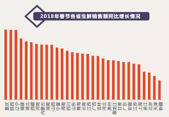 透過京東平臺,來自全球的進(jìn)口海鮮和進(jìn)口水果走上了國民的餐桌,彌補(bǔ)了地域的飲食不均衡,與2017年春節(jié)期間相比,2018年春節(jié)生鮮消費同比增長最快的省份包括重慶、陜西、遼寧、福建、湖北,其銷售額同比增長均超過300%。