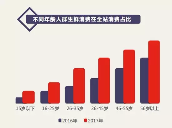 對比不同年齡段用戶在京東平臺的消費結(jié)構(gòu)發(fā)現(xiàn),50后、60后和70后用戶的生鮮消費在其京東全站消費占比最高,可見“銀發(fā)經(jīng)濟(jì)”效應(yīng)在生鮮電商領(lǐng)域更為明顯,網(wǎng)上買菜、買肉的習(xí)慣也在逐步取代菜市場在中老年人心里的地位。