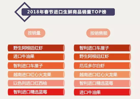 2018年春節(jié)期間,按照銷售額排序,最受歡迎的進(jìn)口生鮮商品為:智利進(jìn)口車?yán)遄印⒁吧⒏⒓t蝦、厄瓜多爾白蝦、越南進(jìn)口紅心火龍果和智利進(jìn)口精選藍(lán)莓。