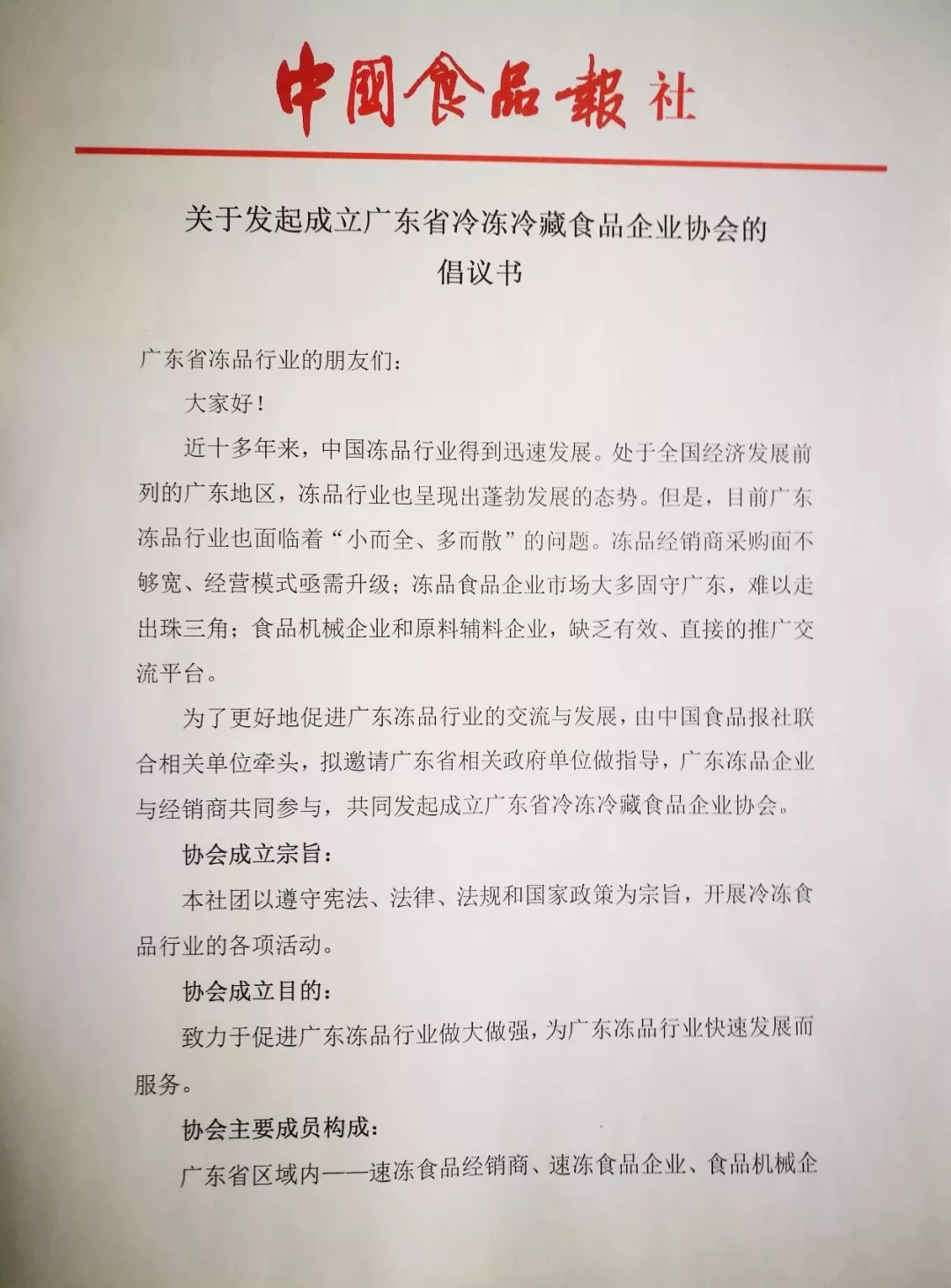 由《中國食品報(bào)》《現(xiàn)代食品》雜志社牽頭,擬邀請廣東省相關(guān)政府單位做指導(dǎo),廣東凍品企業(yè)與經(jīng)銷商共同參與,共同發(fā)起成立廣東省冷凍冷藏食品企業(yè)協(xié)會。