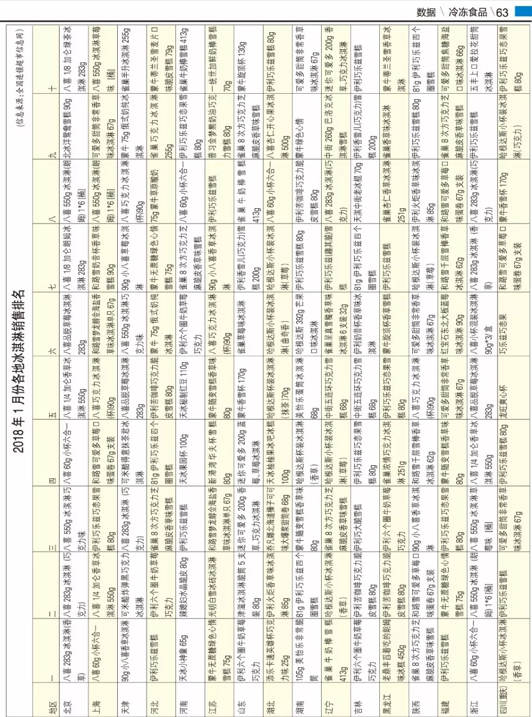 數(shù)據(jù)丨2018年1月份各地冰淇淋銷售排名