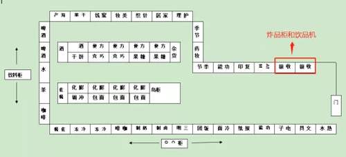上圖是日本便利店在商業(yè)區(qū)的布局圖。從圖中可以看出,日本的店鋪在收銀臺放置了他們主推的炸制品和飲品。(布局源于2017年6月到日本學習時的羅森店)
