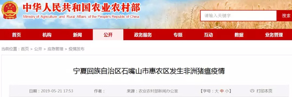 農業(yè)農村部新聞辦公室5月21日17時53分發(fā)布,寧夏回族自治區(qū)石嘴山市惠農區(qū)發(fā)生非洲豬瘟疫情。