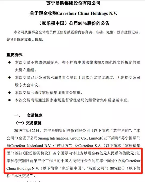 6月23日下午,蘇寧易購公告稱,蘇寧易購全資子公司蘇寧國際與家樂福集團達成協(xié)議,擬48億元收購家樂福中國80%股份。