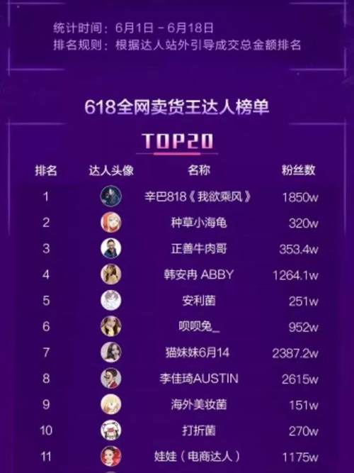 從618根據(jù)GMV(網(wǎng)站成交金額)排名的全網(wǎng)賣貨王達(dá)人榜單上可以看出,電商平臺上,粉絲量與銷售能力并不完全成正比。