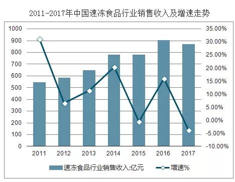 有統(tǒng)計(jì)數(shù)據(jù)顯示,中國(guó)速凍食品行業(yè)規(guī)模從2004年的45.66億元增至2013年的648.81億元,年復(fù)合增長(zhǎng)率達(dá)到30.42%,此后幾年增速放緩,2017年甚至負(fù)增長(zhǎng)。