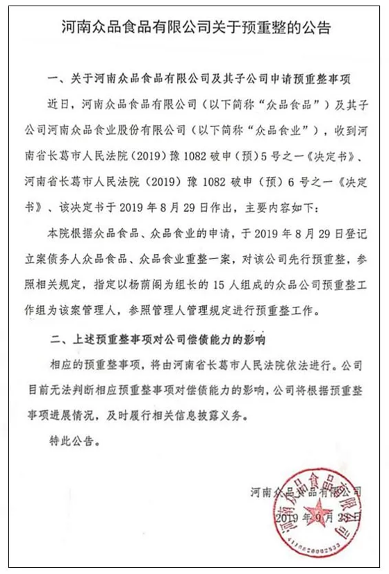 9月23日,眾品食品發(fā)布公告稱,近日,公司及其子公司眾品食業(yè)收到河南省長葛市人民法院下發(fā)的有關破產(chǎn)重整的決定書。上述法院根據(jù)眾品食品、眾品食業(yè)的申請,已于2019年8月29日登記立案債務人眾品食品、眾品食業(yè)重整一案,對該公司先行預重整。