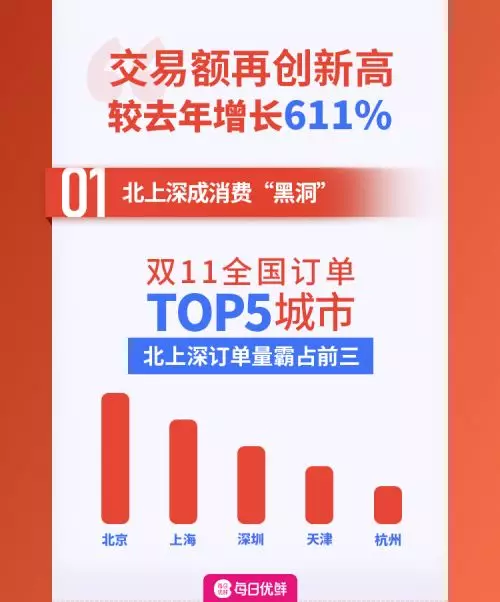 每日優(yōu)鮮報告顯示,今年雙十一,北上深三地的訂單占比持續(xù)霸占全國前三甲位置,排在第四、五位的分別為天津和杭州。