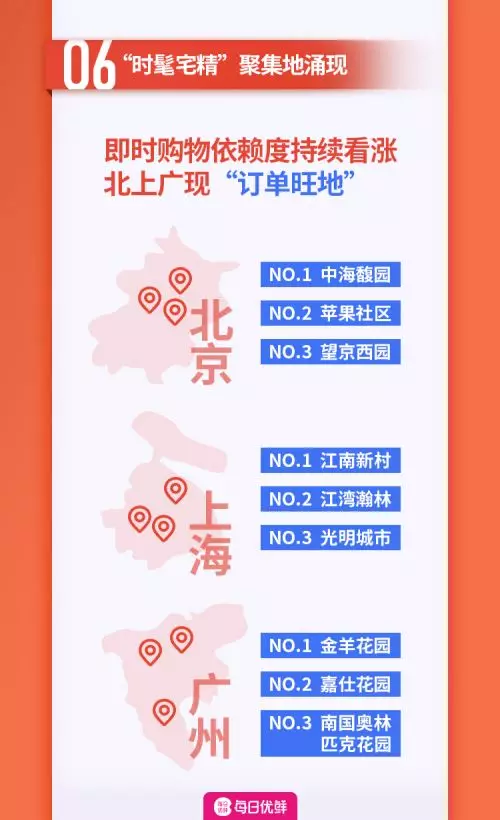 從每日優(yōu)鮮公開的數(shù)據(jù)來看,北京的中海馥園、蘋果社區(qū)、望京西園以及上海的江南新村、江灣瀚林、光明城市, 廣州的金羊花園、嘉仕花園、南國奧林匹克花園正在成為“訂單旺地”,這些區(qū)域的消費者對即時購物的依賴度也越來越高。