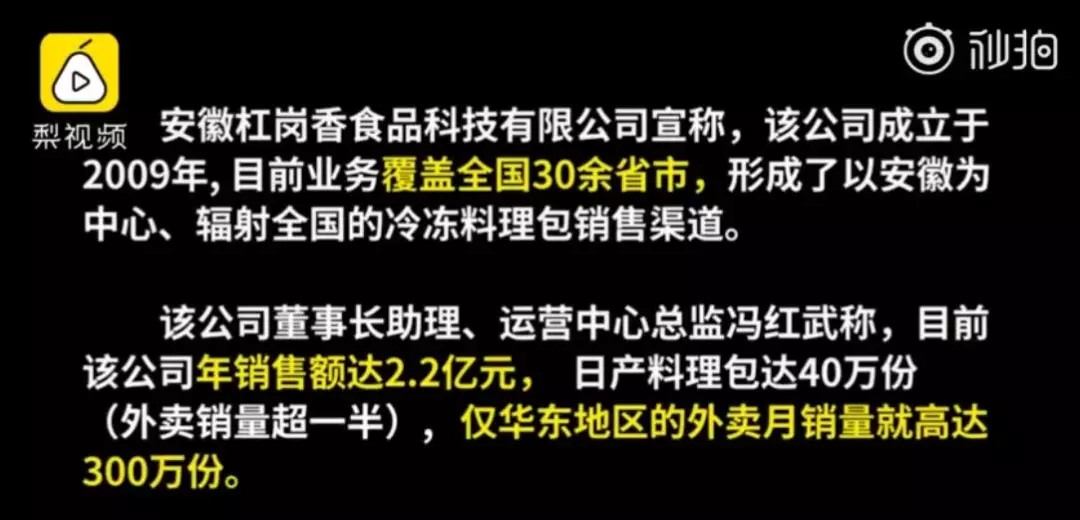 視頻中,安徽杠崗香食品科技有限公司董事長助理、運(yùn)營中心總監(jiān)馮紅武稱,目前杠崗香料理包行業(yè)在全國排在第一梯隊(duì),日產(chǎn)料理包達(dá)四十萬份,外賣超過50%,每個(gè)省都有代理商,一個(gè)月華東地區(qū)銷售額大概一千多萬。
