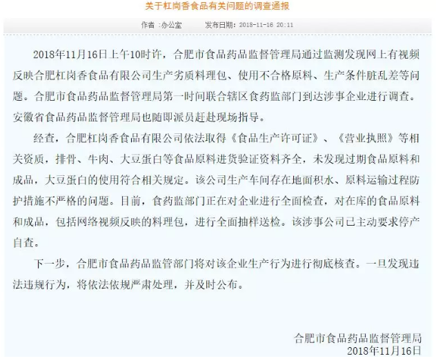 晚上8點(diǎn)11分,合肥市食品藥品監(jiān)督管理局在官網(wǎng)就此事件發(fā)表調(diào)查通報(bào),全文如下: