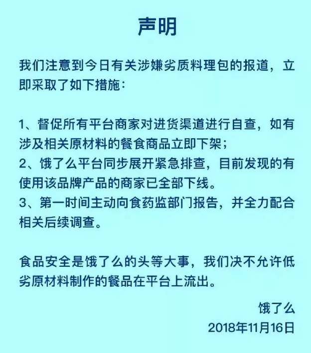 此外,外賣平臺(tái)餓了么也發(fā)布如下聲明: