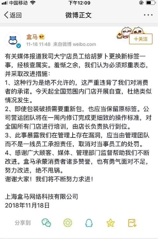 此外,11月18日,盒馬鮮生通過官方微博回應(yīng)稱,該事件經(jīng)核查屬實。即使包裝破損需要重新包,也應(yīng)當(dāng)保留原標(biāo)簽,公司營運團隊將在一周內(nèi)修訂完成更細(xì)致的操作標(biāo)準(zhǔn),對全國所有門店進(jìn)行培訓(xùn),由店長負(fù)責(zé)執(zhí)行到位。該事件暴露了管理的漏洞,應(yīng)由管理團隊而非一線員工承擔(dān)責(zé)任,取消對當(dāng)事員工的處罰。