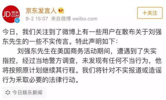 北京時間 9 月 2 日下午 3 點(diǎn) 07 分,京東發(fā)言人在微博上發(fā)聲明稱網(wǎng)上為 " 不實(shí)傳言 ",并表示 " 劉強(qiáng)東在美國商務(wù)活動期間,遭遇到了失實(shí)指控,經(jīng)過當(dāng)?shù)鼐秸{(diào)查,未發(fā)現(xiàn)有任何不當(dāng)行為,他將按照原計(jì)劃繼續(xù)其行程。我們將針對不實(shí)報(bào)道或造謠行為釆取必要的法律行動。"