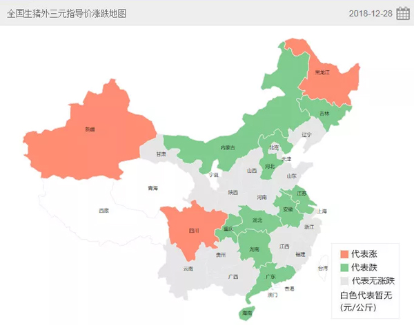 △豬e網(wǎng)統(tǒng)計(jì)的2018年12月28日全國生豬外三元指導(dǎo)價(jià)漲跌地圖