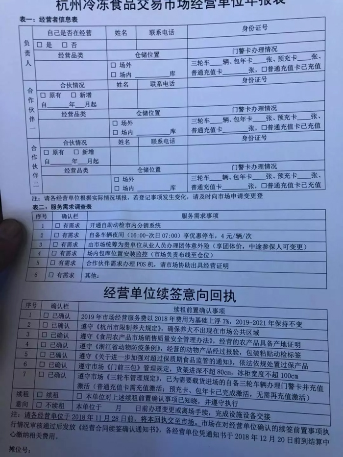 “每年最后一次攤位費和冷庫費一起算,經營單位續(xù)簽意向回執(zhí)一欄中七個確認欄必須全部同意才給交費,不同意就不能續(xù)簽。”商戶張某說。
