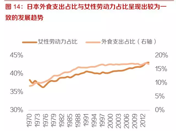隨著生活節(jié)奏的加快,家務(wù)勞動社會化趨勢更加明顯。對比日本,可以發(fā)現(xiàn)家務(wù)勞動的社會化進程中,外食和速凍食品的消化量也在逐年提高。因此可以看出家務(wù)勞動的社會化進程,是外食和速凍食品等便捷式餐飲形式發(fā)展的主要動力。