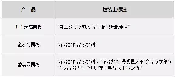 常見面粉品牌中,1+1、金沙河、香滿園等外包裝上,都印有與“沒有添加劑”相關(guān)的字樣。