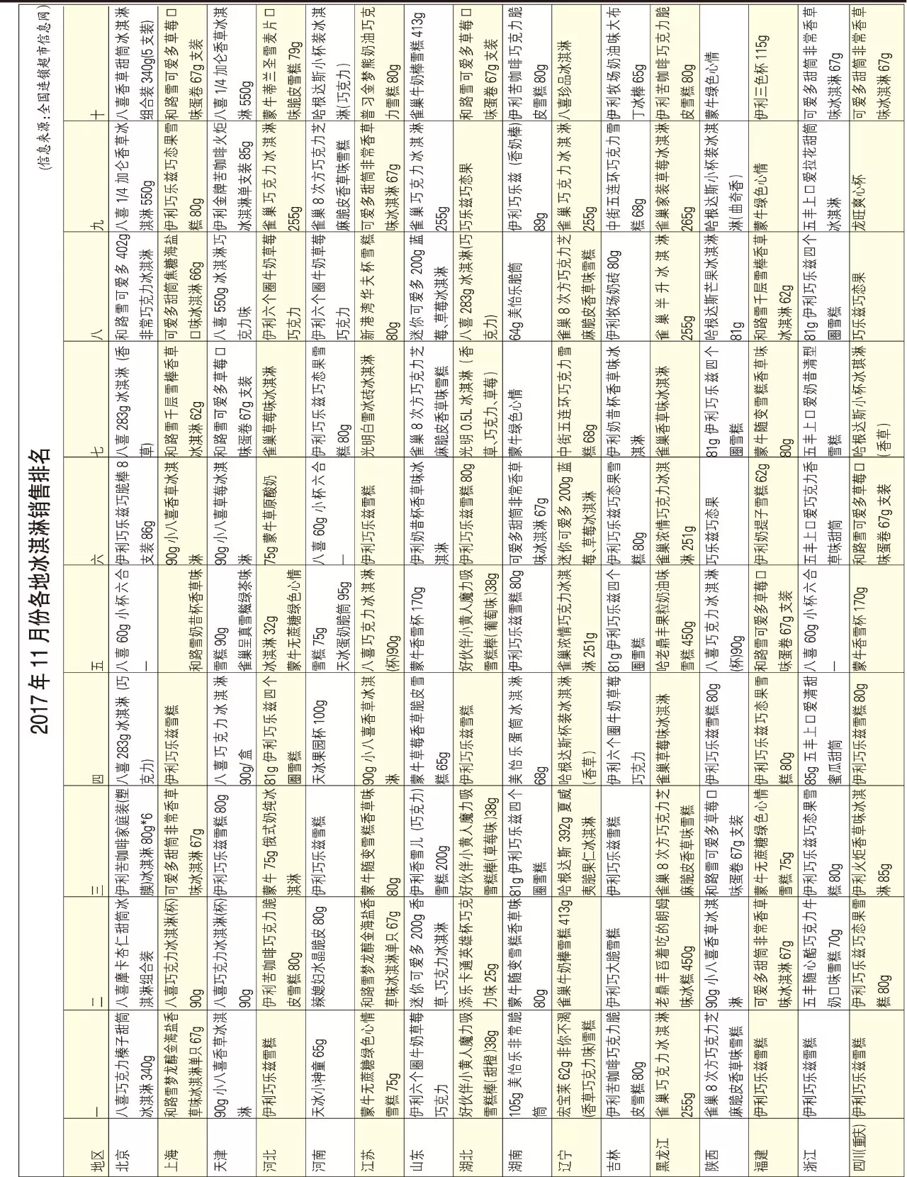 ▼2017年11月份各地冰淇淋銷售排名