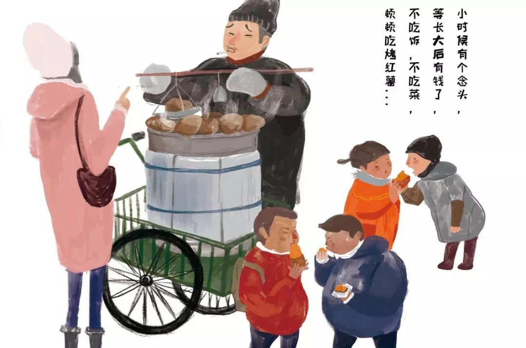 在鄉(xiāng)村,寒冬里親朋好友圍坐烤火取暖時,順便烤上幾個紅薯,邊吃邊聊天,是許多人對老家的永恒記憶;在都市的街頭巷尾,大爺大媽們推著帶輪的烤箱賣烤紅薯也是一道常見的風景;下班后或周末的晚上,用微波爐、電烤箱等烤紅薯更是許多家庭的日常。
